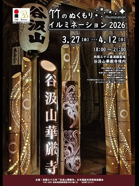 | 職人の手で作られた竹細工で境内を灯します。 竹あかりのやわらかな光が境内を包み込み、幻想的な春の夜を演出します。 写真を撮るのもよし、ゆっくり歩きながら光に包まれるのもよし。 ⁡いつもと違う雰囲気の谷汲山をお楽しみください。 みなさんのお越しをお待ちしています。 |