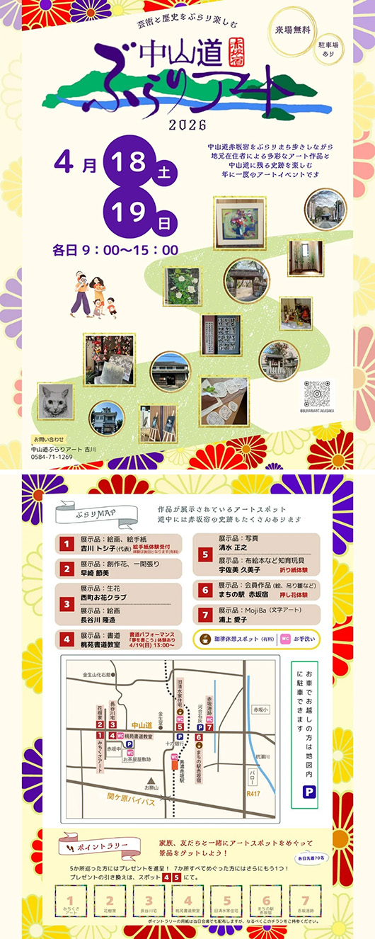 | 入場無料!駐車場あり! 中山道赤坂宿をぶらりまち歩きしながら、地元在住者による多彩なアート作品と中山道に残る歴史を楽しむ、年に一度のアートイベントです。 ◆主な展示作品 文字アート、写真、生花、絵画、書道、一閑張りアート、布絵本など ◆体験コーナー 書道パフォーマンス、絵手紙、折り紙 ◆珈琲休憩ブース(有料) 旧清水家住宅、まちの家赤坂宿 ◆ぶらりポイントラリー 指定の展示スポットを巡り、ポイントを集めると景品をプレゼント! ※各日先着70名 |