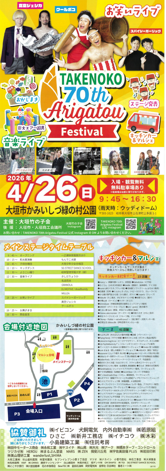 | 入場・観覧無料!無料駐車場あり! ◆お笑いライブ ・真空ジェシカ ・クールポコ ・スパイシーガーリック ◆音楽ライブ ・きしだりょうか ・GRANOLA ・DJ MOTIVE/deadbundy ・MILLEA ◆ステージ発表 ・和太鼓演奏 ・子供合唱団 ・キッズダンス ・よさこい踊り ◆お菓子まき ◆キッチンカー&マルシェ ◆巨大エアー遊具 |