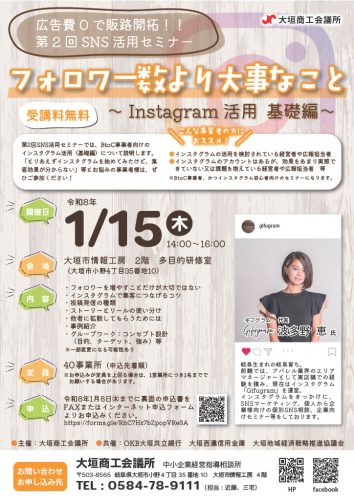 ※BtoC事業者、かつインスタグラム初心者向けのセミナーになります。すでにインスタグラムを活用できている事業者様やインスタグラムの操作方法等について知りたい方は、大垣商工会議所までご相談ください。個別相談をご案内します。