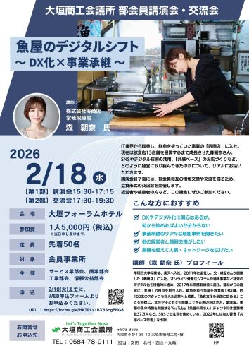 部会員の資質向上と相互の交流を深めるため、部会員講演会並び交流会を開催します。第1部では、登録者数37万人YouTubeチャンネル「魚屋の森さん」でもお馴染みの、株式会社寿商店 常務取締役の森朝奈氏にご講演をいただきます。『魚屋のデジタルシフト~DX化×事業承継』をテーマに、IT業界から鮮魚を扱っていた家業に入社し、SNSやデジタル技術の活用、「共感ベース」のお店づくりなどで事業を成長させたことなどについて、体験談等をリアルにお話いただきます。また、講演会後には、部会員相互の情報交換や交流を深めるため、立食形式の交流会を開催します。経営者や後継者の方など、この機会にぜひご参加ください。