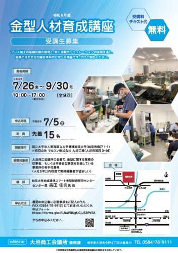 大垣商工会議所では、岐阜大学地域連携スマート金型技術研究センターと連携し、プレス加工の基礎知識の習得と絞り実験やシミュレーションの実習を通し、実務で活かせる知識を体系的に学ぶ「金型人材育成講座」を開催します。ぜひご参加ください。